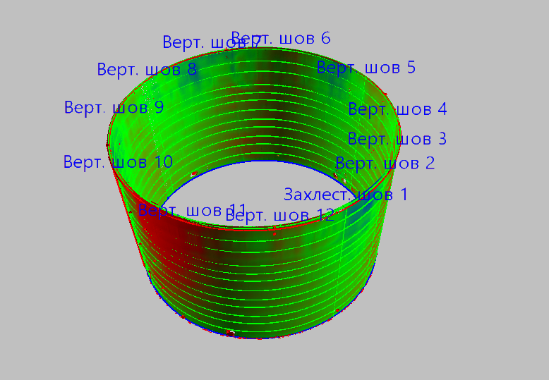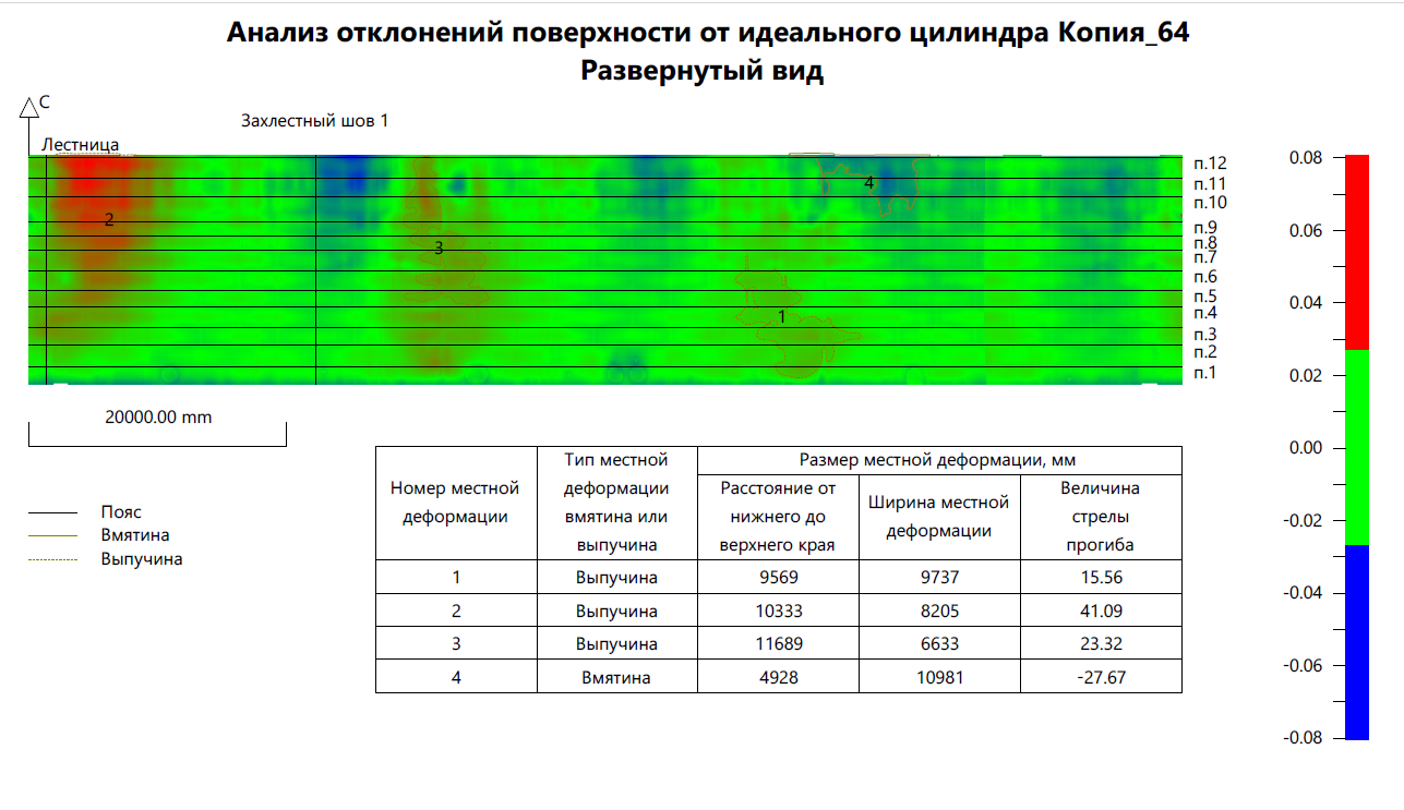 Заключительный этап — подготовка отчета: оператор отмечает места расположения вертикальных и горизонтальных сварных швов. Полученная сетка создает систему координат для плоского представления, на основе которого строятся графики отклонений швов. На графическом представлении четко видны фактические смещения, нормативные допуски и все точки, не соответствующие этим допускам.