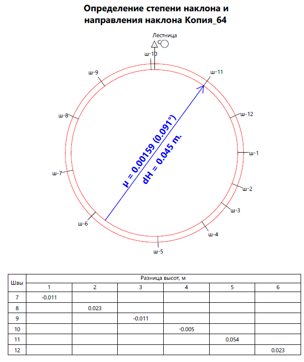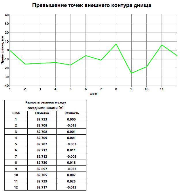Используя данные, зафиксированные в области уторного шва, система строит график общего наклона резервуара и график уклона днища, дополняя последний подробной таблицей.